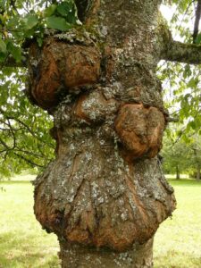 Sur l’écorce, cherchez des fissures profondes, des plaies qui ne cicatrisent pas et des zones où la résine s’écoule. Les chancre(s) et les attaques d’insectes peuvent être visibles sous forme de galeries ou de taches brunâtres. Des champignons, des moisissures noires ou des masses de gomme peuvent aussi trahir un dépérissement interne. Examinez aussi la base du tronc et les zones proches du sol; une écorce qui se détache ou des signes de détérioration du bois peuvent indiquer une atteinte grave.